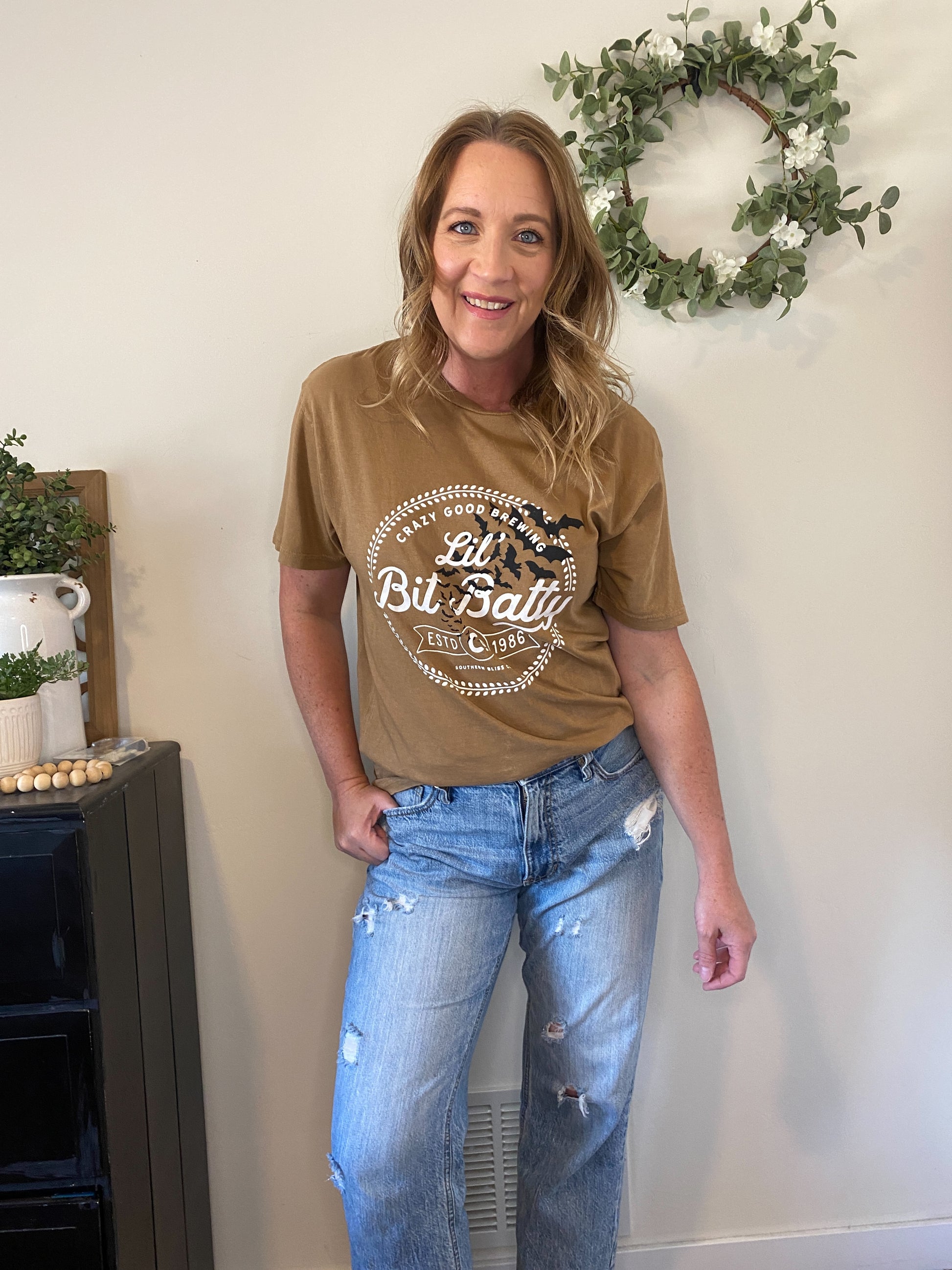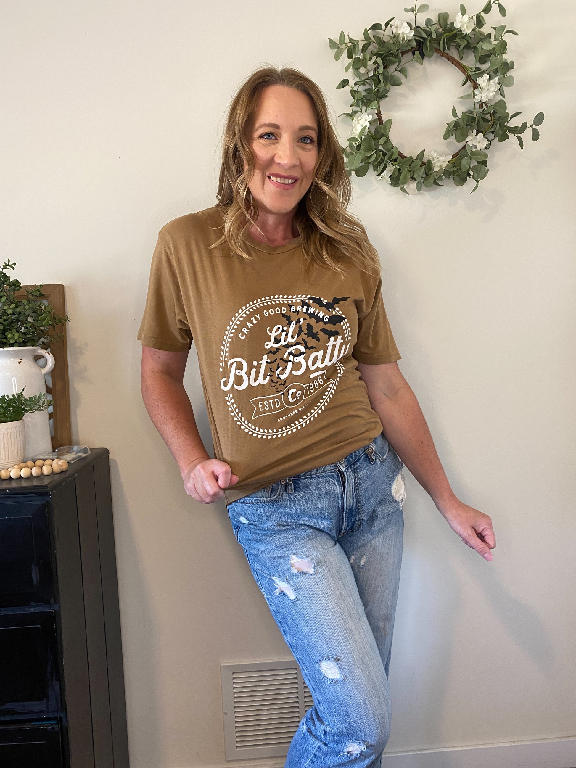 Aren’t we all a “Lil Bit Batty”? This cute tee will have you smiling every time you wear it! Heather is wearing a medium.