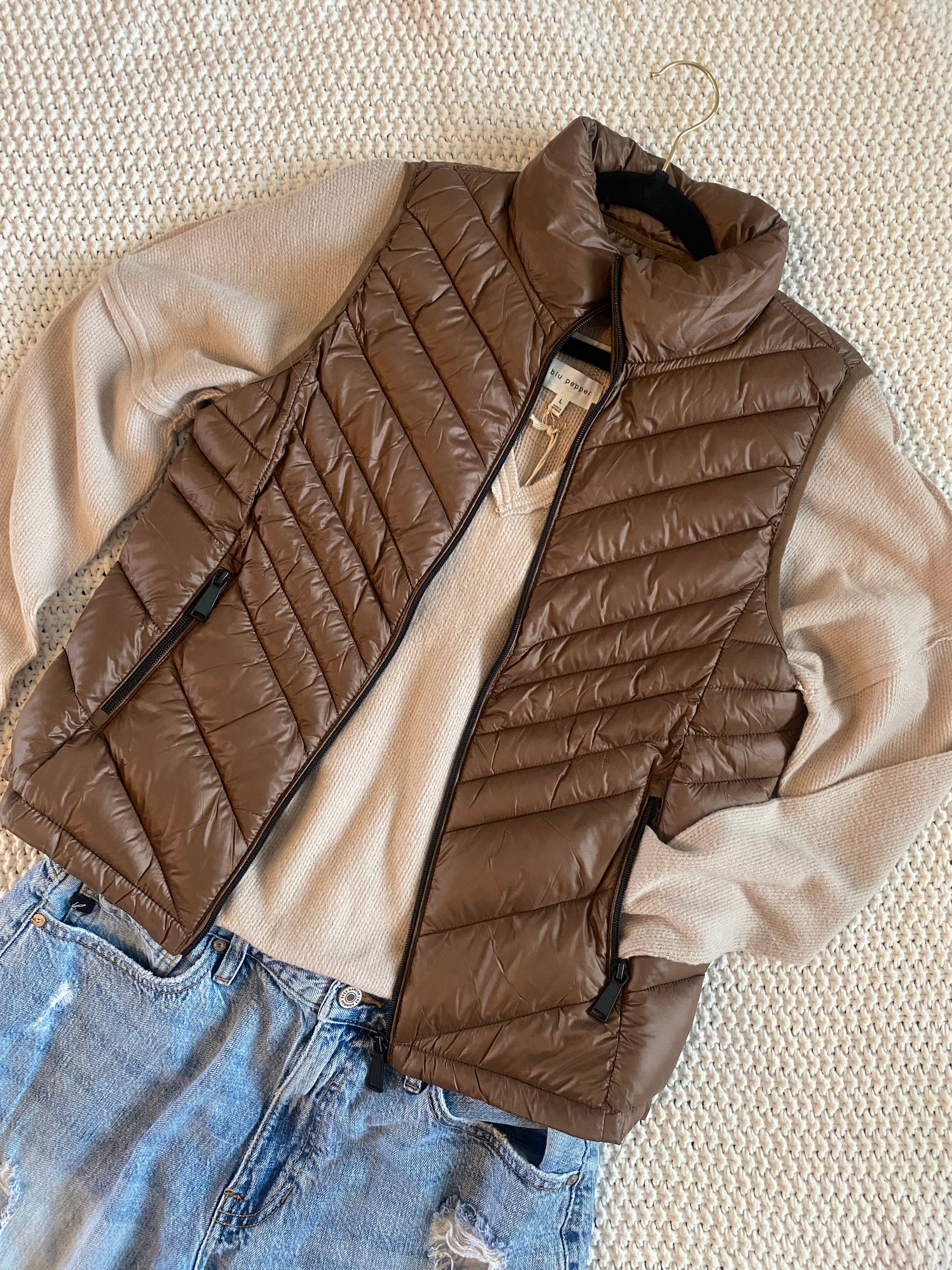 Timber will add a fun touch to all of your fall tops. The diagonal stitching has a slimming effect and the black zippers provide a perfect contrast. Fits true to size, Heather is wearing a medium. Measurements are with the vest zipped.